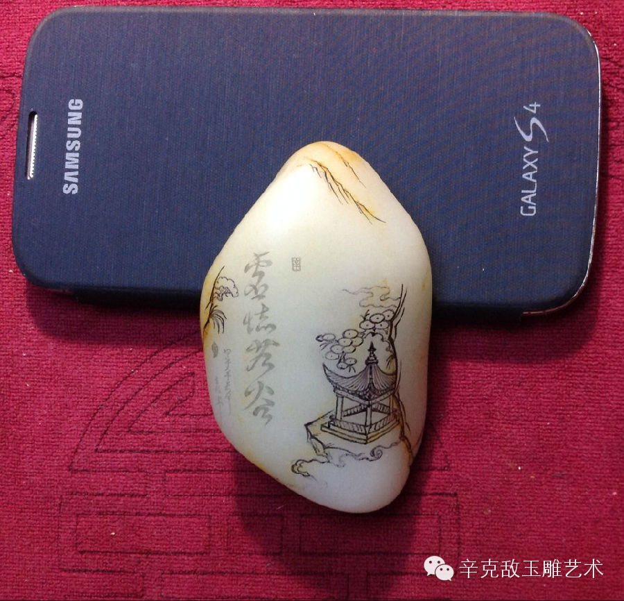 一位客户拿来一块和田玉籽料,料很干净,细度也不错,没有杂质,唯独有几条裂纹,特别显眼,辛大师经过一番研究,决定用薄意山水来避掉裂纹,这样既避掉了裂纹,也保全了料子的最大完整度,是一个不错的想法。让我们看看他是怎么设计的。 不错吧,意境深远,布局得当。辛大师说做人要虚怀若谷,才能保罗万象。