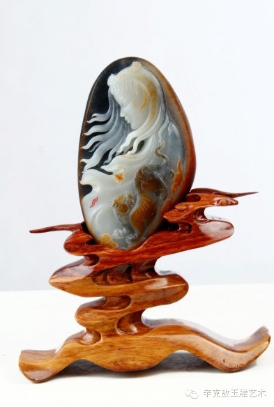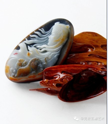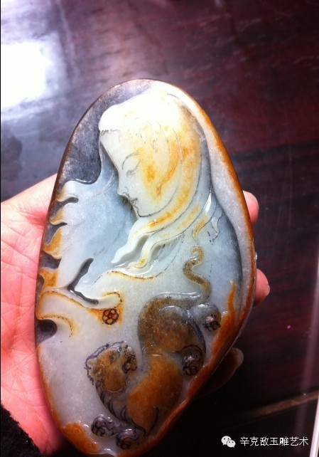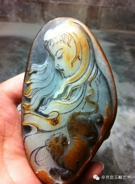 此作品使用一块和田玉青花籽料做成,辛大师巧妙的利用青花的黑白两色黑的部分做成背景,白部分表现少女,还有一块黑带黄的部分做成赤豹,巧色恰到好处,布局相得益彰,黑白分明,线条流畅。